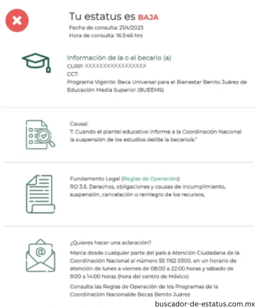 Cuando tu estatus aparece como “BAJA”, significa que ya no formas parte de los beneficiarios del programa.