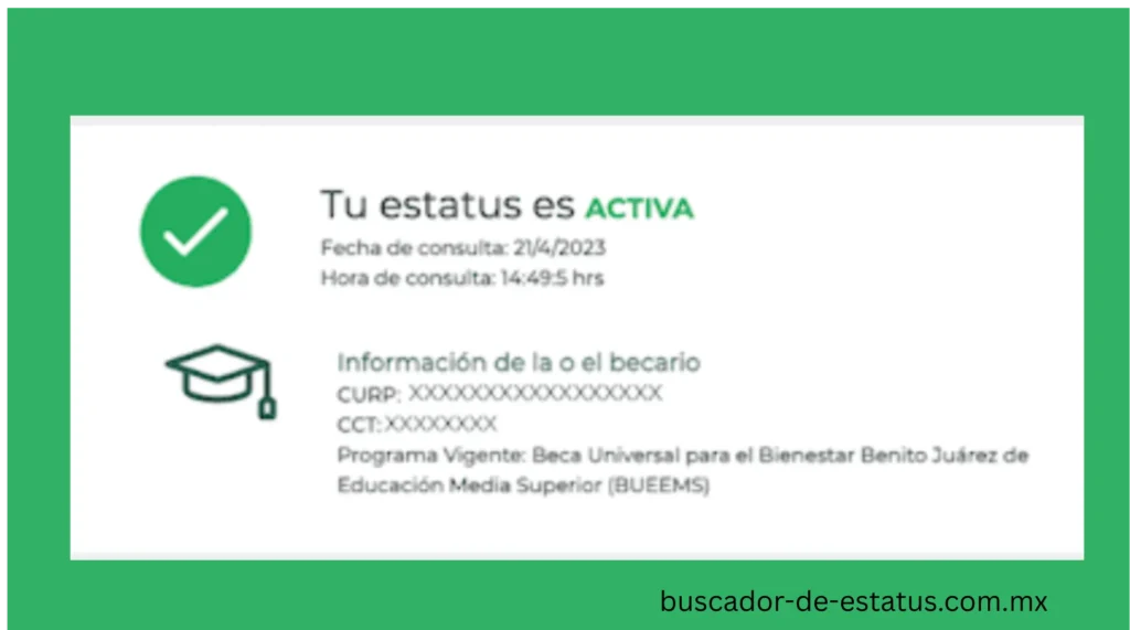 Cuando tu estatus aparece como “ACTIVA”, significa que formas parte de los beneficiarios de algún programa de becas (ya sea de nivel Básico, Medio Superior o Superior). En este caso, podrás visualizar información detallada como: